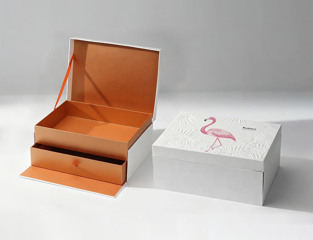High-End Rigid Box Construction: We utilize a premium, sturdy rigid box structure (like the lift-off lid and the drawer-style box shown) which provides superior product protection and a memorable, unboxing experience.