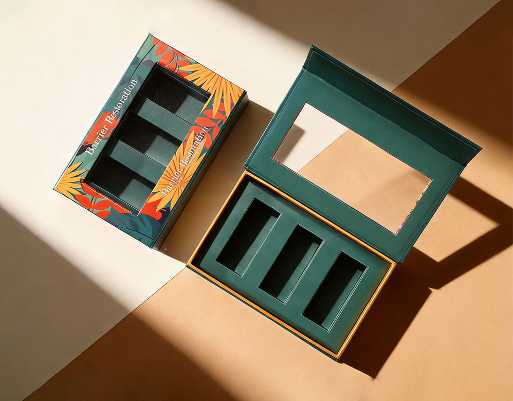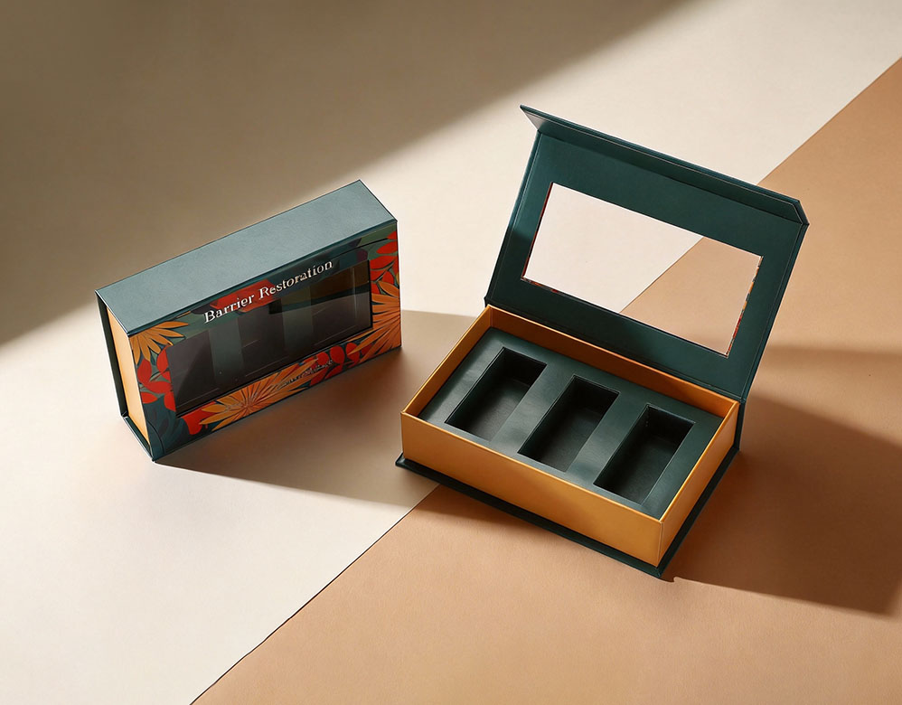 This essential oil gift box is designed to hold three bottles securely with a custom insert structure. The rigid paper box with magnetic closure offers strong protection while creating a premium unboxing experience. The window design allows customers to preview the product inside, making it ideal for retail display, gift sets, and aromatherapy collections.