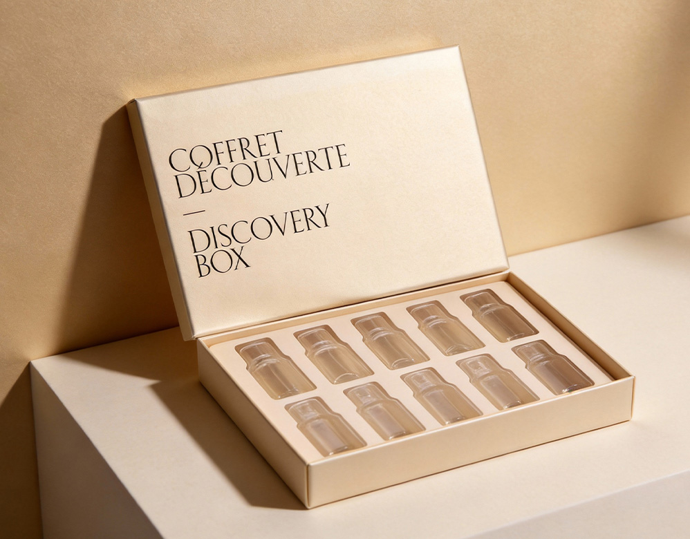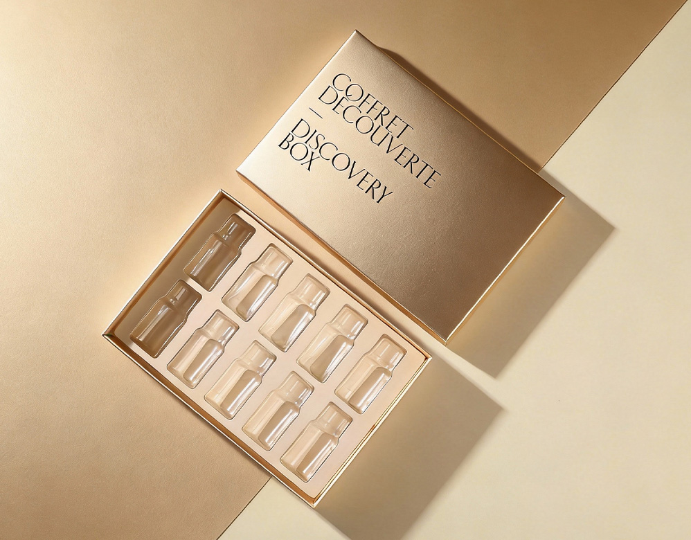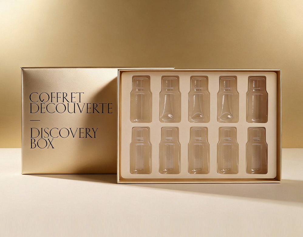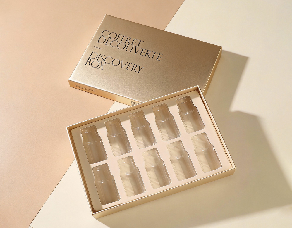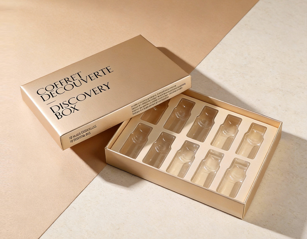 Essential Oil Discovery Gift Box: This 10-bottle essential oil discovery box is designed with a classic lift-off lid rigid structure, offering both protection and an elevated presentation for essential oil sets. The precision-molded insert securely holds each bottle, ensuring safe storage, easy display, and a refined unboxing experience.